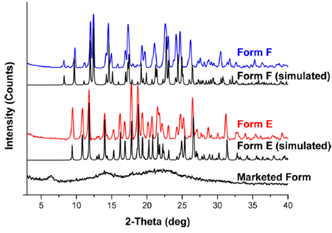 XRPD patterns of distinct polymorphs differ in the number of peaks, their 2θ positions, relative intensities, and even line shapes. Consequently, an XRPD diffractogram serves as a “fingerprint” for polymorph identification.